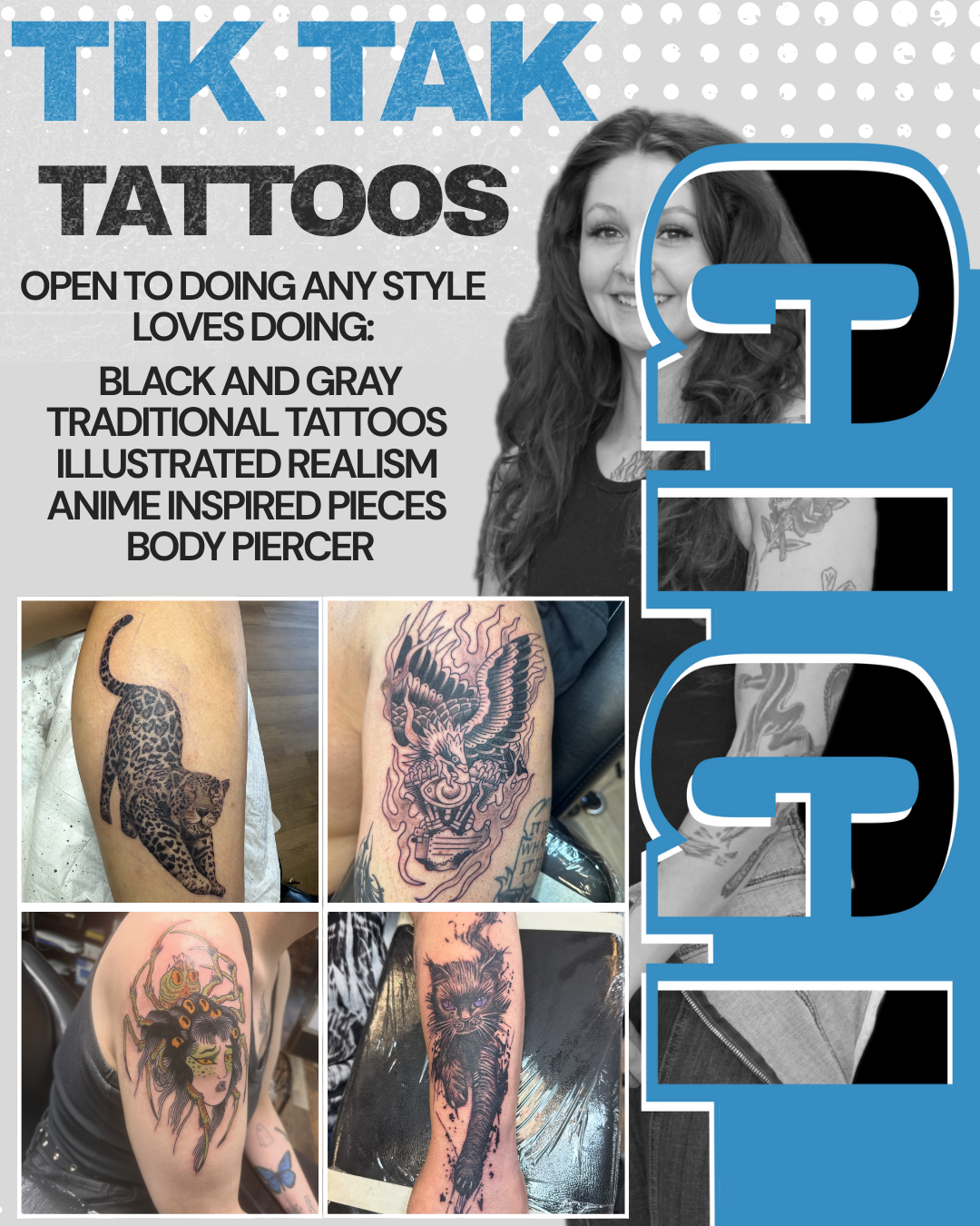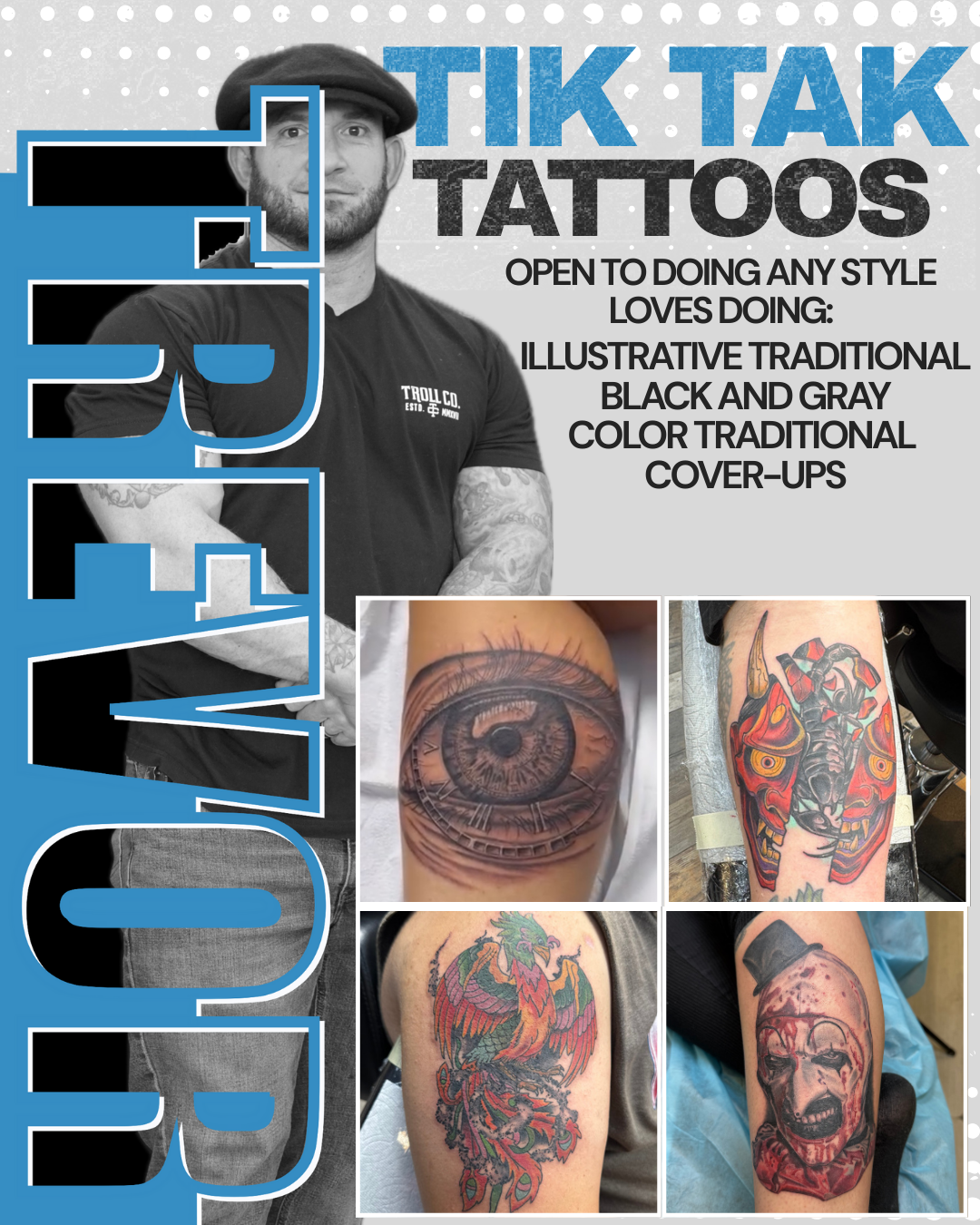 Welcome to my Tik Tak Tattoos. Whether you're looking for bold traditional designs, intricate black and gray realism, black work, or vibrant neo-traditional art, We specialize in multiple tattoo styles to bring your vision to life. Based in Carson City Nevada, We take pride in creating high-quality, custom tattoos in a professional and welcoming environment. Explore our portfolios, book a consultation, and let’s create something unforgettable together!